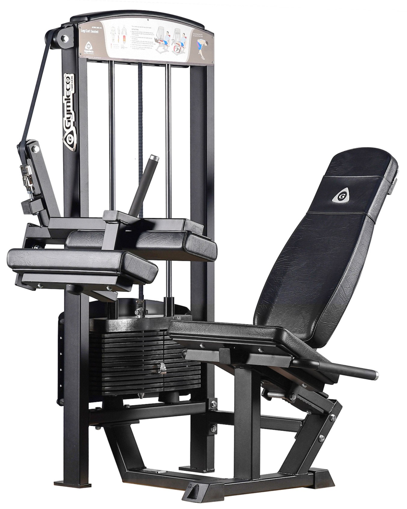 This seated leg curl Gymleco machine effectively trains the backside thighs or hamstrings. Sit down in the leg machine, place your legs in between the foot supports and bend your legs towards your body. The exercise focuses on the backside of your legs but also works out other muscle groups such as your calves.